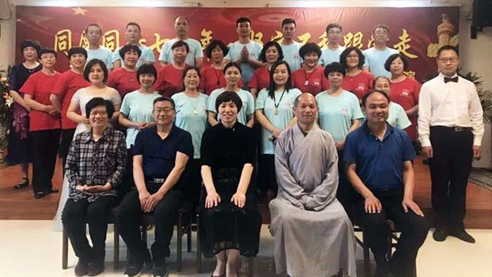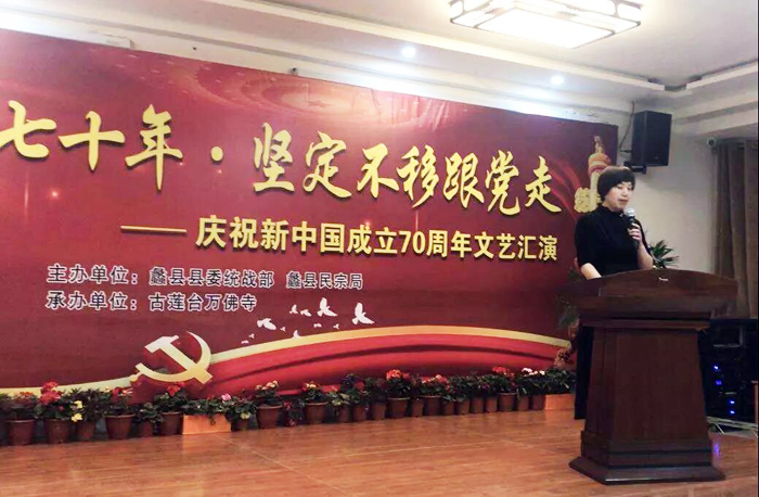 在激昂的国歌声中,”同愿同行七十年,坚定不移跟党走— —庆祝新中国成立七十周年”文艺汇演正式拉开了序幕,县统战部部长沈贺丽为此次文艺汇演发表讲话:沈部长表示:蠡县各宗教活动场所坚持中国化方向,为促进社会和谐稳定做出了积极贡献。万佛寺起到了带头表率作用,今天这次文艺会演既是新中国成立七十周年庆祝活动,又是双创四进活动持续深入开展的重要体现。