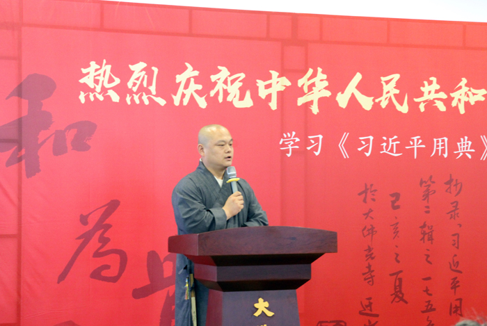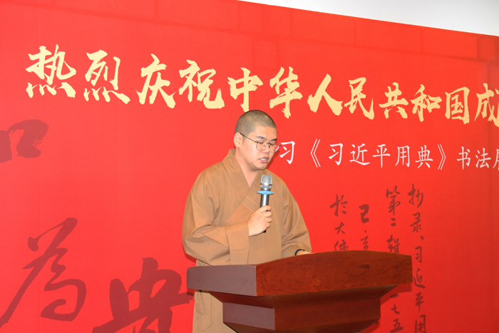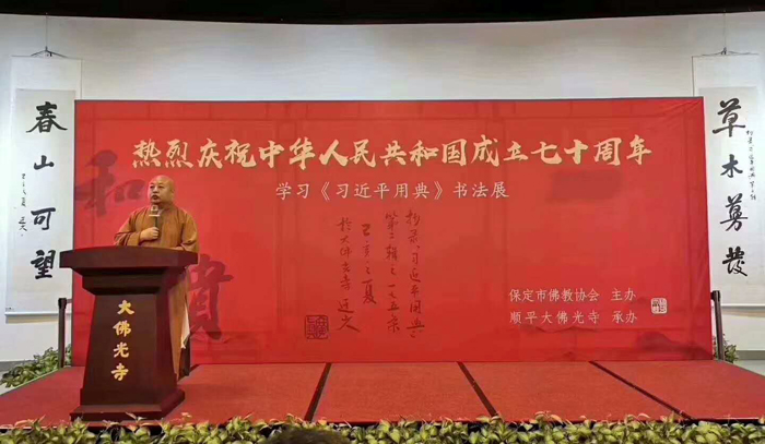 首先由河北省佛教协会咨议委员会主席、保定市佛教协会会长真广法师致开幕词:感谢省佛协、市委统战部、市民宗局的领导对此活动的大力支持,及在百忙之中莅临此次活动。 真广法师讲到:我们不但要学习《习近平用典》的精深妙义,更要从中激发我们对优秀传统文化的热爱,激发我们对伟大祖国、对社会主义制度的热爱。还要勇于担当,牢记使命。服务社会,利益众生。要始终坚持佛教中国化方向,积极践行社会主义核心价值观,加强场所建设,提高管理水平。推动“双创四进”活动再上新台阶,向祖国70华诞献礼。