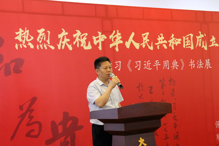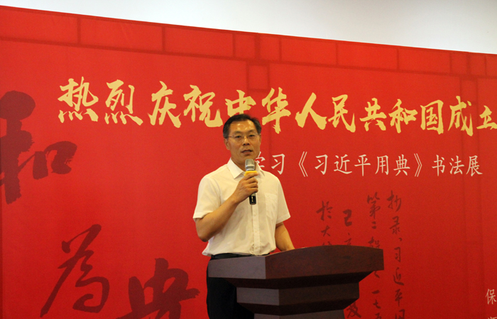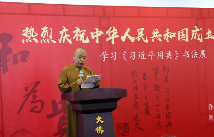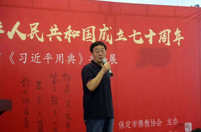 董少卿局长赞扬此次书法展是保定佛教界一次有重大意义的活动,必将产生积极的引领作用,他概括出三点:1、突出了政治品质;2、体现了一种爱国情怀;3、展示了一种创新精神。他代表民宗局对所有法师表示慰问,对支持佛教的各界朋友表示感谢。