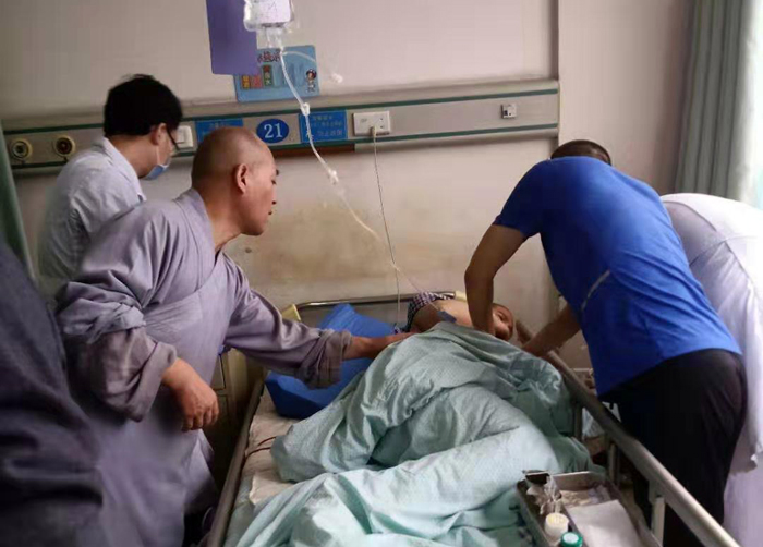 在灭火过程中,悟光法师不慎从高处落下,腰部脊柱受伤。被大家连夜送到县医院,后又迅速转到保定252医院治疗。 悟光法师是保定佛教界的优秀僧才,曾参加过两届讲经交流活动,刚完成河北省统战部的宗教界人士大专班学习,现正在南京佛学院学习,法师救火负伤住院后,市佛协工作人员受会长真广法师委托前去医院慰问,梁庄村两委宋锁柱 ,赵东才和受灾家的外甥女都赶来医院看望救火受伤的法师,梁庄村老书记袁景乐,老村长梁爱民等大众闻讯都赶来医院看望、慰问。