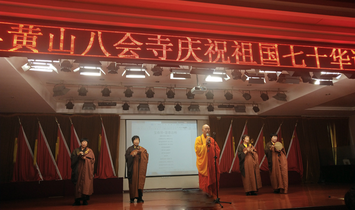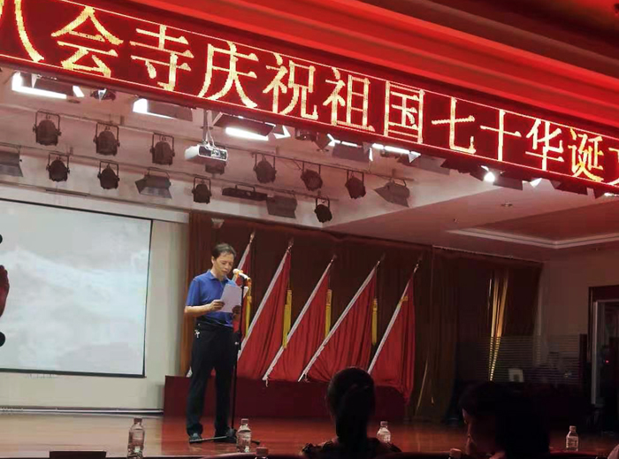 首先由八会寺住持能振(德成)法师致欢迎词:八会寺的发展历史使我们深刻地认识到,没有共产党就没有新中国。没有共产党开创的太平盛世,就没有佛教事业的发展兴盛。在祖国盛世华诞到来之际,让我们用歌声、用舞蹈表达对祖国的热爱;让我们用诗词、用歌赋展示我们的欢欣与激动。