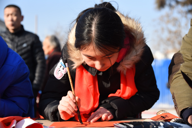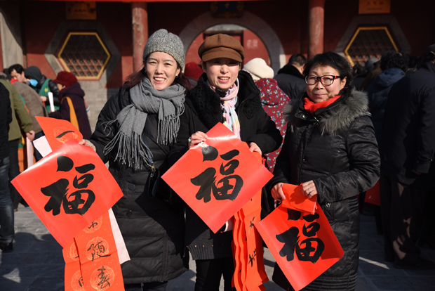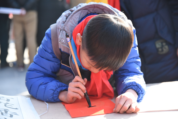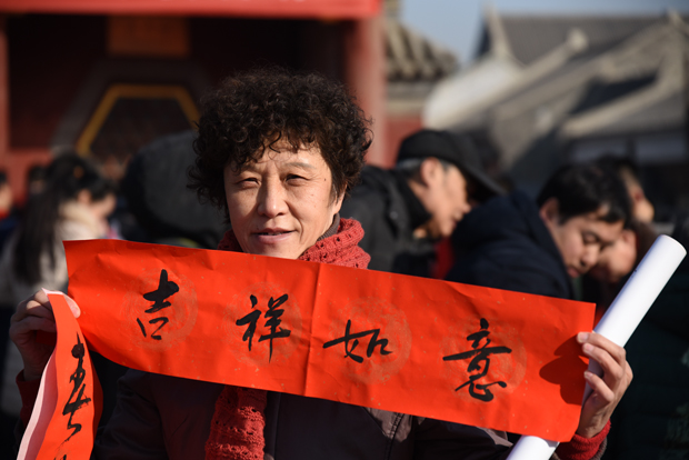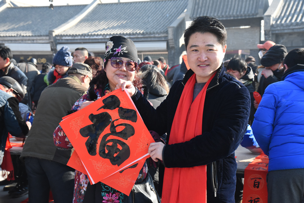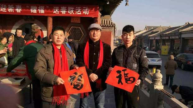 大慈阁月台上书法家们和书法爱好者们云集,挥毫泼墨。尤其是刘五辈书法学校的小朋友们,不畏严寒的来为大家书写春联。大家高兴的请到了真广法师送给大家的“福” 字,并带着请到的春联,带着吉祥的祝福,满意回家!