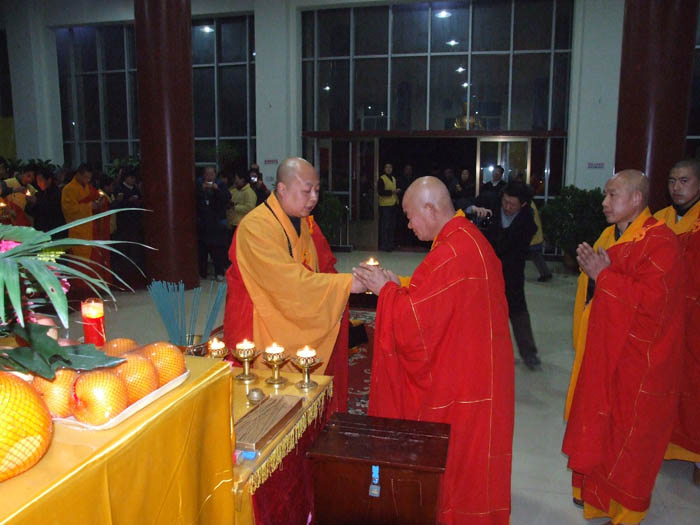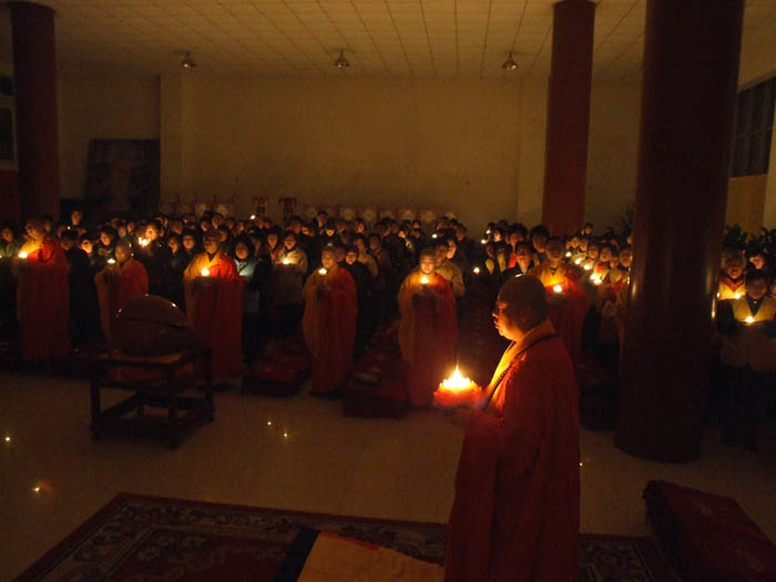 法会首先由真广法师为大家开示供灯的意义,并为大家祝愿祈福,在消灾延寿药师佛的佛号中,法师们将手中的灯,灯灯相传、福福相授,由此人们深刻的感受到供灯及学佛的意义,对佛陀的感恩崇拜之情油然升起,随后大家在法师的带领下一步一步走向大雄宝殿,将手中的灯供于本师释迦牟尼佛前,恭敬礼拜而退。