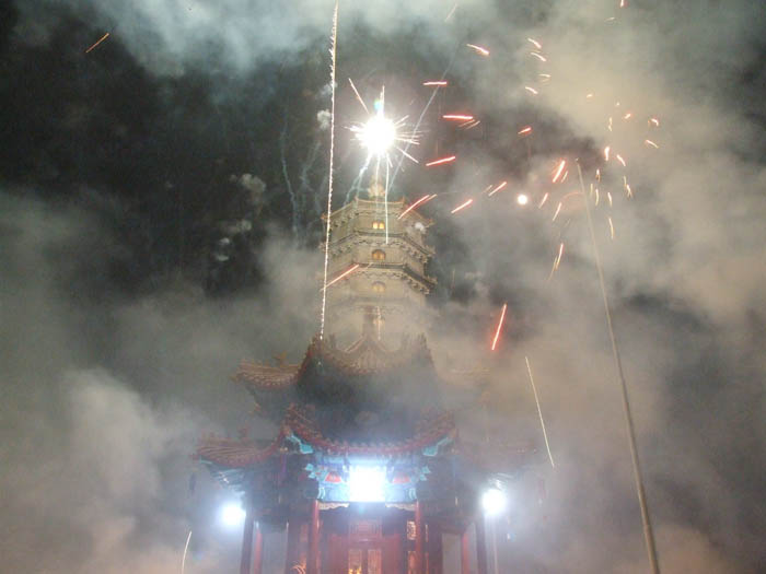随着外面烟花礼炮的鸣响,法会进入了最后一项活动,漫天的多彩烟花礼炮,将观音寺映照的分外动人,古塔、大殿在烟火照耀下也是显得分外庄严。