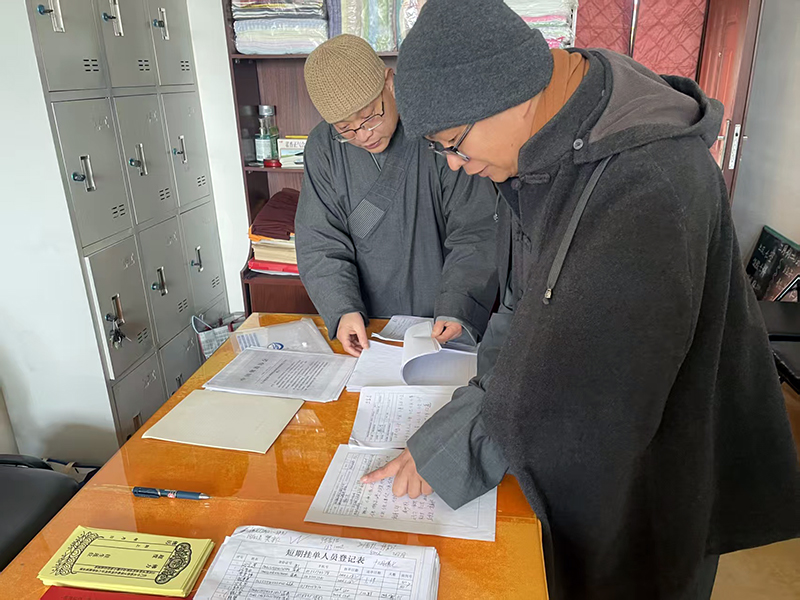 检查期间,寂禅法师对四处场所的活动实施方案、学习心得、会议记录、整治整改台账等材料逐项核查,并结合实际提出针对性指导建议。