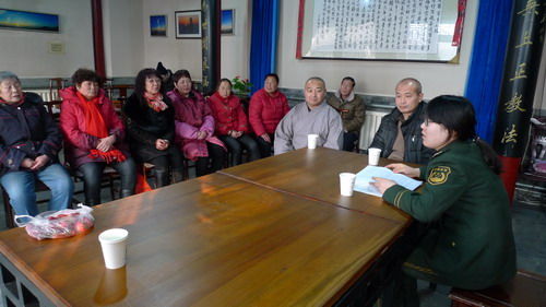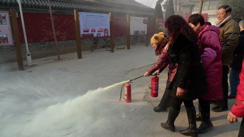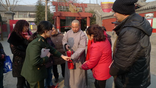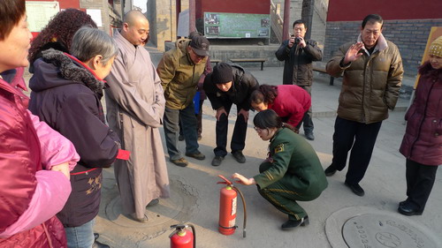 张参谋根据大慈阁的古建筑特点,重点提出几点注意事项,1、重点预防人工用火及游客吸烟;2、发生火灾的正确处理次序;3、自我保护和逃生能力;4确保消防通道畅通。最后在大慈阁院中,张参谋指导大家怎样正确使用消防器材,通过学习大家普遍提高消防知识,居士们纷纷表示寺院就是自己的家,一定尽心尽力保护好寺院的安全。