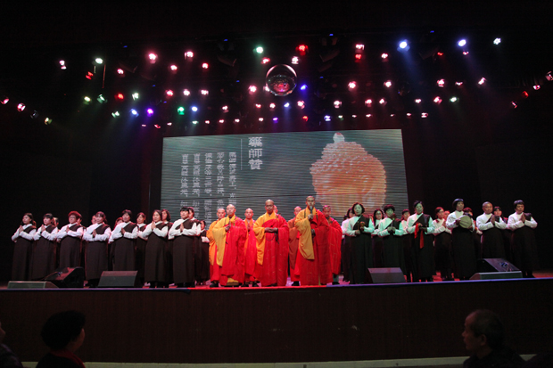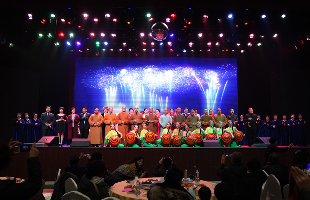 晚会随着由法师和居士合唱的《药师赞》拉开序幕,今年的晚会节目可以说是精彩纷呈,舞蹈有:由可爱的小朋友表演的《小马奔腾》,歌唱家戴晓玉、王建军主唱的歌伴舞《十送红军》,歌曲有:赵娟演唱的《天边》,张宁演唱的《放下所有的缘》,戏曲有:石艳梅表演的老调《忠烈千秋》选段,霍新艳表演的评剧《小酸枣》,陈锦华表演的河北梆子《打金枝》,李小田表演的京剧《打虎上山》,以及大型长征组歌《娄山关》,晚会在李想领唱的一曲《难忘今宵》中圆满结束。