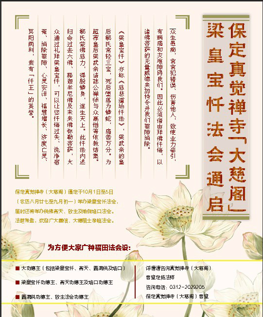 保定佛教资讯网讯:保定真觉禅寺(大慈阁)将于10月1日------5日举办梁皇宝忏法会,祈福当下,超荐过亡。「梁皇宝忏」乃梁武帝为超度其夫人郗氏所制。据《南史梁武德郗皇后传》载,后酷妒忌,及终,化为龙,入于后宫,通梦于帝,或现形,光彩照灼。又据《释氏稽古略》卷二载,梁武帝初为雍州刺史时,夫人郗氏性酷妒,既亡,化为巨蟒,入后宫通梦于帝,帝制《慈悲道场忏法》十卷,请僧行忏礼,夫人遂化为天人,在空中谢帝而去。其忏法行世,称梁皇忏。