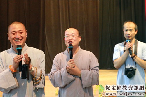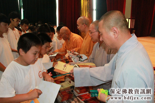 然后由保定市佛教文化研究院院长寂禅法师发表讲话,对此次夏令营圆满结束表示祝贺,观音寺监院道智法师对参与此次活动的义工菩萨表示感谢,并祝福小朋友们快乐每一天。徐水兜率寺住持明月法师对夏令营的圆满举办表示祝贺。保定市佛教协会秘书长王长革发表讲话。欢迎小朋友和家长们来到观音寺,并祝贺夏令营的成功举办,希望孩子们明年继续参加。最后由法师们为小朋友们发放结缘书籍以及合影照片。