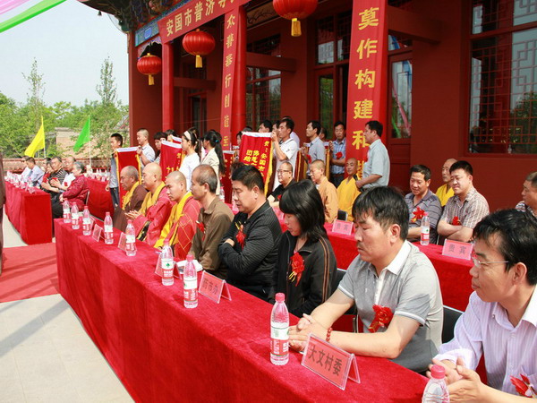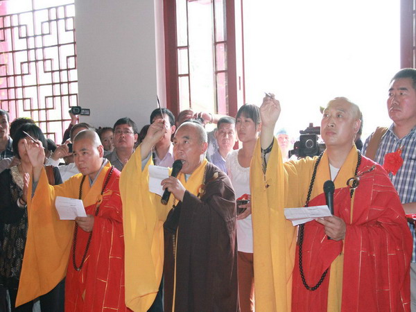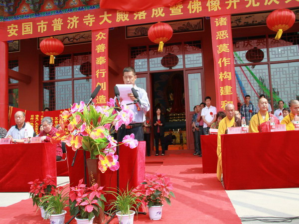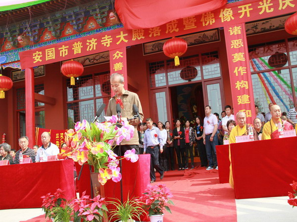 保定佛教资讯网讯:2013年5月18日,安国大文普济寺念佛堂举行佛像开光庆典,由大善国寺住持明舟法师、华严寺住持如光法师、佛光寺监院道悟法师主法开光。安国民宗局吕建斌局长致贺词并为场所揭牌,保定市佛教协会秘书长王长革致贺词,参加开光法会的各界人士和信众近千人。