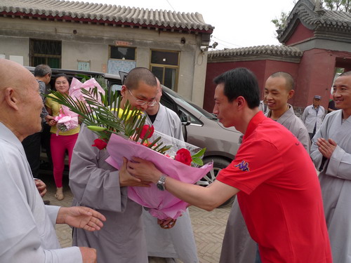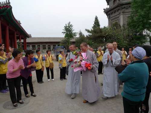随后由市佛协秘书长王长革陪同真源法师一行回到观音寺,受到了观音寺监院道智法师及两序大众的夹道欢迎,真源法师在大家的陪同下先到大殿礼佛,然后到方丈楼拜望等候在这里的师父 (真广法师)。