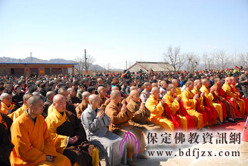 保定佛教资讯网讯:2013年4月6日,阳光明媚,漫山的杏花开满了山坡,保定顺平佛光寺隆重举行了开工典礼(2010年星云大师为佛光寺奠基之后,经过历时近两年的前期准备工作),参加典礼的领导有保定市委统战部副部长王连水、保定市民宗局局长闫兰申、顺平县县委书记张丽娟、县长王永建以及清苑、高阳县相关领导,嘉宾有启骧先生、画家李味辛女士等等,佛教界有亲如法师、尊行法师、果纬法师、道泓法师、如光法师、妙严法师、净山法师、恒意法师、能莲法师、愿弘法师等, 以及来自各地的近两千佛教信众参加了本次典礼。