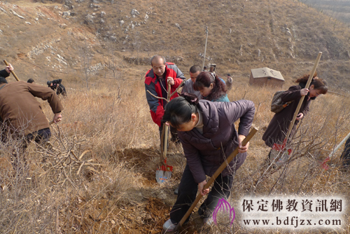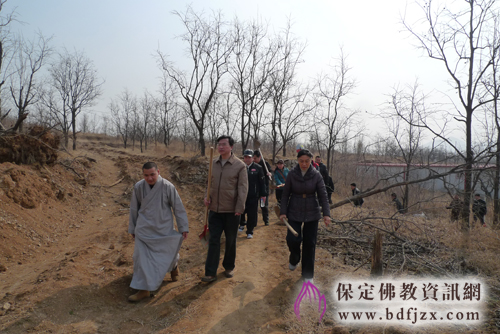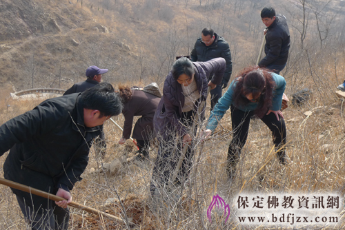 保定佛教资讯网讯:2013年3月20日,保定市民宗局响应市委、市政府提出的“着力改善发展环境、着力改善生态环境”的要求,全力打造我市天蓝水净、地绿山青的生态环境,积极组织宗教界开展落实这项工作。并组织市民宗局全体干部到顺平佛光寺参加植树活动。市民宗局局长闫兰申和班子其他领导同20多名机关干部参与了此次活动,