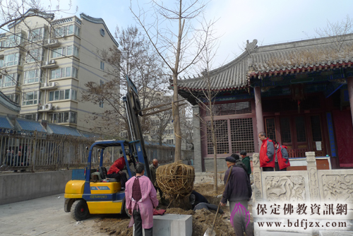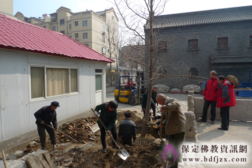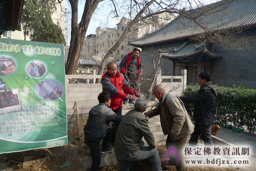 保定佛教资讯网讯:2013年3月20日,保定佛教协会为响应市民宗局在全市宗教界掀起“改善环境 善美保定 从我做起”活动的号召,市佛协会长真广法师对这个活动非常重视,安排佛协办公室人员积极实施,并首先在佛协办事处“关岳行宫”栽植大型银杏树及玉兰树,为全市佛教场所绿化起到带头作用。