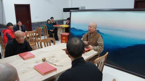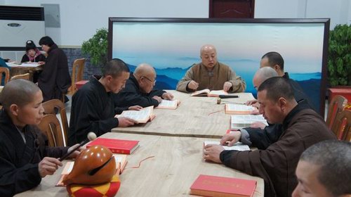 另外师父建议课诵做一些调整,早殿可以九点,这样来寺烧香的人有机会听闻法音;也可以摆放桌椅坐着念,年岁大的人站立一个小时是很辛苦的。师父幽默地说,藏传和南传佛教徒都吃肉而且坐着念,我们汉传吃素反而站着念,这不公平,因该罚吃肉的站着才对,我们听了哄堂大笑。