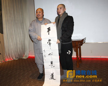 与会大众在真广法师法师慈悲法雨的沐浴下,法喜充满,积极与法师互动,交流自己的学佛心得,并先后以诗歌朗诵、佛曲演唱等方式,表达了自己对佛法的至诚好乐及对真广法师无上感恩之情。其间,真广法师还将自己亲笔题写的“平常心是道”的墨宝,现场赠送给京剧名家裘纪戎先生,以此勉励大家日日精进,用心学佛。据悉,真广法师多年来坚持讲经说法,并采取适应现今年轻人喜闻乐见的文艺表演、佛教文化沙龙等形式弘法,至今已先后组织过200多期不同形式的弘法活动。并针对近年来由于种种原因致使邪说横行、歪理频传,影响了正法的传播而组织成立了日新学社,以“阐扬佛教真谛、传播真正佛法、培养正确价值观、实现自他的真正幸福”为学社宗旨,在日常学习中通过读书、讲解、研讨、践行,实现学社宗旨。