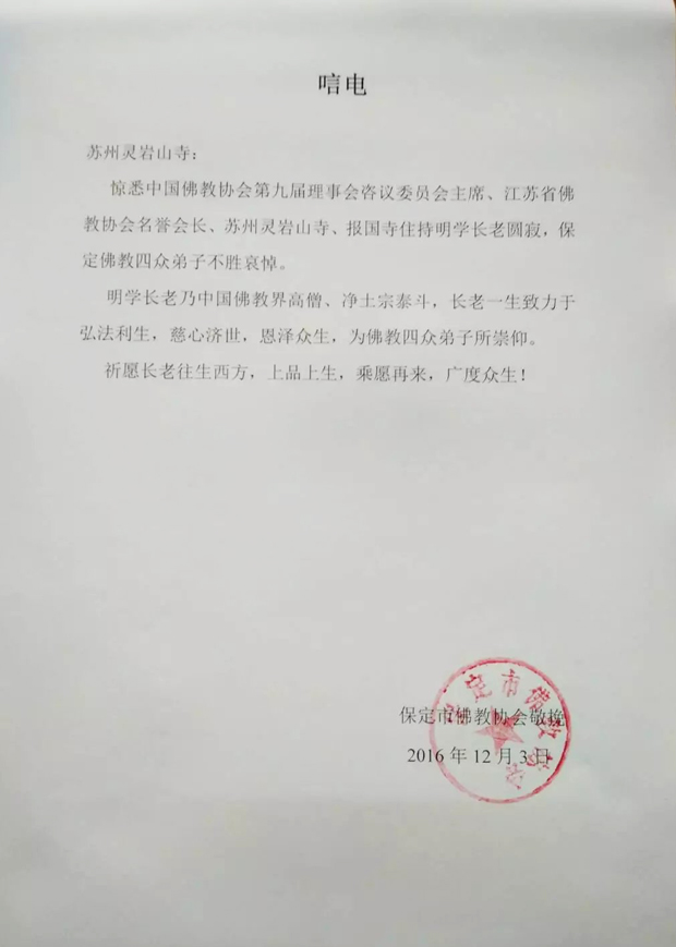 惊悉中国佛教协会第九届理事会咨议委员会主席、江苏省佛教协会名誉会长、苏州灵岩山寺、报国寺住持明学长老圆寂,保定佛教四众弟子不胜哀悼。