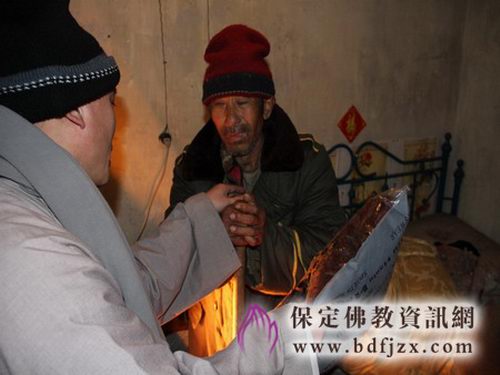 保定佛教资讯网讯:保定佛协爱心社的“暖冬”慈善活动,在保定市区及周边县,已经连续进行数日了。2012年12月19日晚,去徐水的观音寺道禅法师组,经过一天的进户慰问,回到保定,已经很晚了,在大慈阁用晚斋时,保定市佛协会长、大慈阁住持真广法师询问他们一天的慰问情况,当道禅法师说:在到户木村一位叫徐勇的单身村民家中慰问时,看到徐勇因病导致生活不能自理,生活的十分艰难。在当地村民的照顾下,勉强度日。在这寒冷的冬日,连一床御寒的被子都没有时,真广法师放下筷子,面色变得十分凝重。对道禅法师说:“你们明天再去一趟,前些时有一位居士供养我一床被子,赶快给他拿去,顺便再送一些过冬的毛毯、保暖内衣等物品,”听到真广法师这样的安排,在座的数人无不为法师的慈悲所感动。