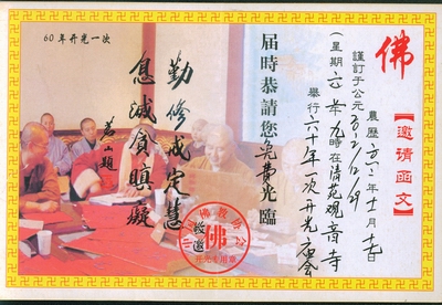 现在郑重声明:观音寺、大慈阁、佛光寺从没有发请柬化缘一事,举行皈依也只有在寺院举行,皈依时间是每月的初一,十五。