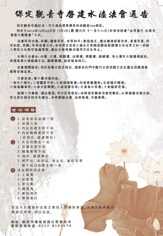 敬请十方檀越、护法善信,早日莅寺登记;或与保定观音寺客堂联系,以便填写功德文疏,安立长生禄位和往生莲位。并希亲临法会,拈香植福,共襄善举。