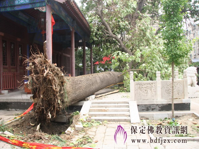 关帝庙有灵 2012年7月3日晚,一场罕见的狂风席卷了古城保定,保定佛协办事处驻地关帝庙前的一棵梧桐树被连根拔起了。工作人员说前年为了安全就想把这棵树伐掉,伐树工人碍于这棵树的树冠大部分都在殿宇的顶部不好操作而作罢,此树直径一点五米,高约二十米,没想到昨晚的大风让这棵大树自己倒在了殿宇的左前方,幸好没有砸到殿宇,周围的居民都说这个庙真有灵验。