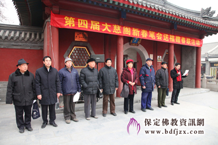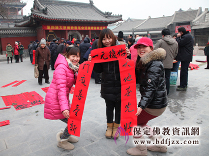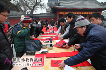 保定佛教资讯网讯:2012年1月16日,保定市真觉禅寺(大慈阁)举办了第四届新春笔会送福赠春联活动。本次活动邀请了保定竹林书画社等二十位书法家前来助阵,为大众义写春联,现场好一派热闹的景象。