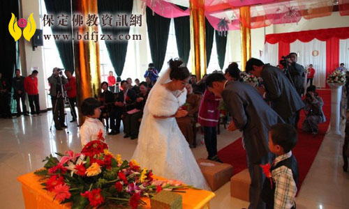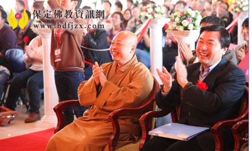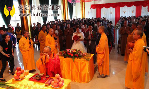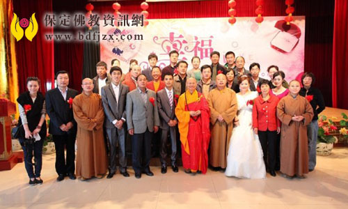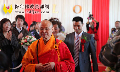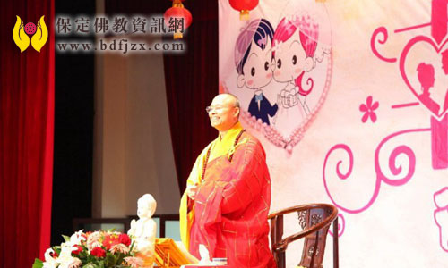 心定大和尚对新人表示了祝福,祈求佛菩萨保佑新人婚姻幸福美满。心定大和尚首先用星云大师著作的题目勉励新人,分别是《心甘情愿》、《皆大欢喜》以及《传灯》。鼓励大家要常常以感恩的心想到父母,亲戚朋友,工作同仁,如果需要关心帮忙要主动去做,让双方的父母,亲戚朋友,工作同仁都能够感觉到家庭的幸福快乐,这就是皆大欢喜,《传灯》则是把佛教的真理代代相传,以德传家,孝顺,报恩,对人尊重和谐,要慈言爱语,存好心,说好话,做好事,常常以爱的眼神关怀对方,相互要尊重,赞美,学会沟通,倾诉,鼓励,最重要的是要有感恩的心,每一个人都要靠父母养育,师长教导,受到很多人的恩惠,感恩父母,师长,国家,要懂得回报。