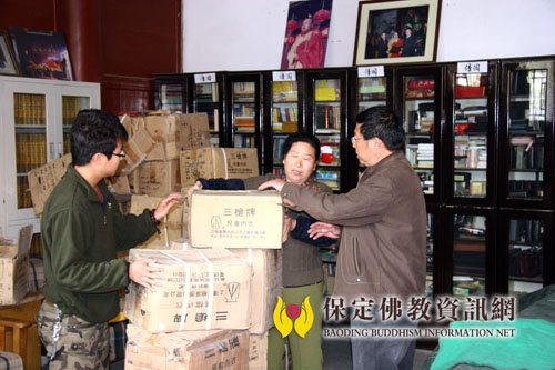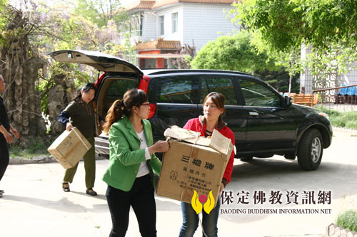 保定市社会福利院的工作人员将佛协送来的衣服搬下车