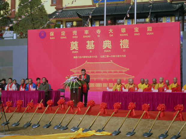 典礼由保定著名主持人中华老师主持。上午十时,典礼正式开始,首先由兜率寺住持明月大和尚致欢迎词:感恩诸佛菩萨的加被,各级领导的支持和关怀,十方大众的鼎力护持,今天兜率寺的快速成长,与各位的支持是分不开的,感谢大家的莅临!接下来功德主代表、石家庄恒达房地产开发有限公司董事长周中记居士和大雄使者代表、福建泉州三和茶业有限公司副总经理杨辉居士分别致辞,两位居士一致表示:在师父的带领下,仅仅用了三年多的时间,广历诸缘,呕心沥血,一期工程顺利完工,二期工程即将开始。今后会更加坚定地支持兜率寺的发展,希望大家以后也继续支持师父,支持兜率寺。