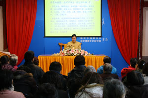 2011年2月20日星期日上午九点,大慈阁“莲池讲坛”由陈松鹤博士继续为大众汇报《大乘无量寿经研习报告》第五十六。