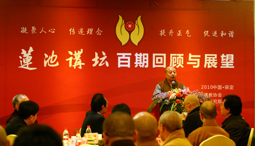 保定佛教资讯:百分百的努力,百分百的辉煌。由保定市佛教协会发起、保定佛教文化研究院创办的《莲池讲坛》活动,至今已经度过了一百期的峥嵘岁月。为答谢一直以来支持与参与《莲池讲坛》的各级领导专家学者及社会各界朋友,2010年12月25日上午九时,由保定市佛教协会会长、保定市真觉禅寺住持真广法师发起,保定市佛教协会主办的《莲池讲坛百期回顾与展望座谈会》在保定电谷锦江酒店隆重开幕。
