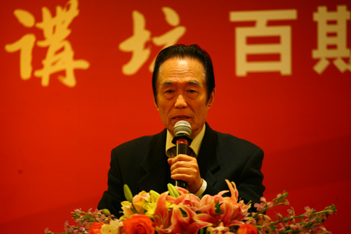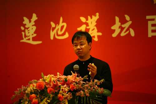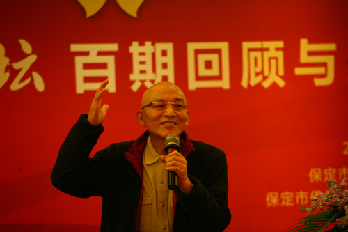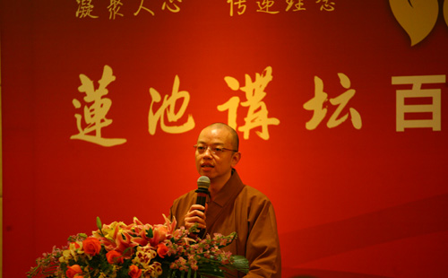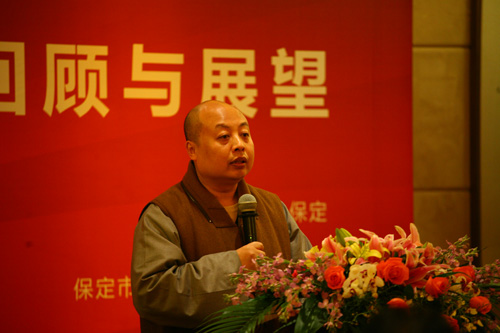 活动的开始请与会嘉宾观看了《莲池讲坛》百期回顾纪录片,现场氛围轻松独特。本次活动由真广法师致开场辞,真广法师对各位来宾表示了深深的敬意与感谢,抒发了今后办好讲坛的决心与希望。温金玉教授用“法音宣流,震悟大千”高度评价了《莲池讲坛》的特色价值。阎崇年教授在讲话中指出,信仰佛教是社会和谐的润滑剂,希望通过《莲池讲坛》这个平台向中国人弘扬正气、促进和谐、影响大众,强调了温金玉教授说到的“为天地立心,为生民立命,为往圣继绝学,为万世开太平”这一言辞,并对真广法师的大愿心表示了赞叹与鼓励。启骧先生谈到了他的愿望,他希望全国各地每个城市都有《莲池讲坛》。游本昌老师结合自身的体会,更是深情并茂表达了他的想法,游老谦虚地说,“是《莲池讲坛》成就了我,菩提事业,善莫大焉!”接下来,李泓处长、李正如局长分别作了讲话,谈到了对传统文化发展事业的期望,以及《莲池讲坛》对构建和谐社会做出的杰出贡献表示了肯定。慧宽法师指出了建设文明、和谐的心灵工程的重要性,揭示了让生活更幸福的真谛。安虎生先生讲到,《莲池讲坛》不是属于保定的,也不属于佛教,它属于世界!精炼的概括温暖了大家的心,使我们更加坚定了脚下的路和决心。