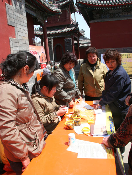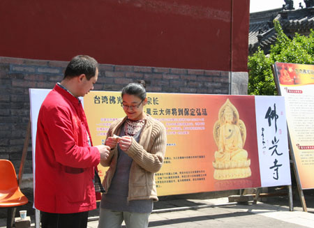 保定佛教资讯网资讯:2010年4月28日(农历三月十五)上午保定市真觉禅寺(大慈阁)举行祈福放生法会,真觉禅寺住持真广法师开示并主法。随着天气逐渐变暖,越来越多的信众参加到法会中,喜闻佛法,同沾法喜。法会现场,热心的居士们还带来家传的中药配方,为大众免费医治,中午,真觉禅寺准备结缘斋饭,供大众食用。