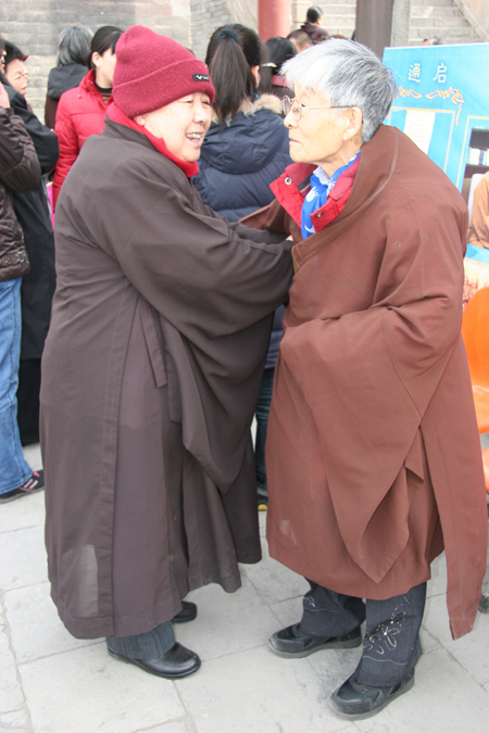法会现场的老居士互相帮助