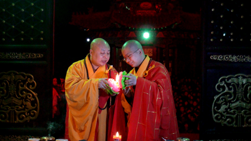 晚上七点法会在观音寺大雄宝殿正式开始了,殿里殿外都站满了前来参加法会的居士,信众们怀着虔诚的心手托着寄托着人们各种愿望的祈愿灯。