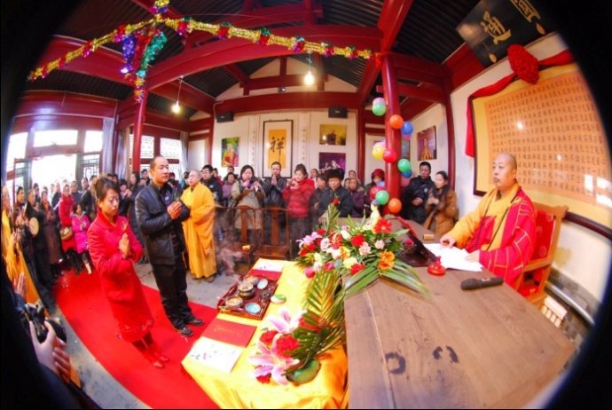 保定佛教资讯网讯 2010年1月3日,保定大慈阁瑞雪纷纷、喜气洋洋。大家兴高采烈的为芮军、刘伟冉在这里举行佛化婚礼。请真广法师为之福证。