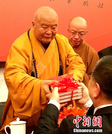 佛教在线北京讯 2015年4月15日上午,由人民出版社推出、星云大师总监修的《献给旅行者365日——中华文化与佛教宝典》出版座谈会在人民大会堂新闻发布厅召开。星云大师专程从台湾赶来,并献上一段长达20分钟的精彩发言,他希望弘扬中华文化,更动情地说,“我其实从未离开中国”。