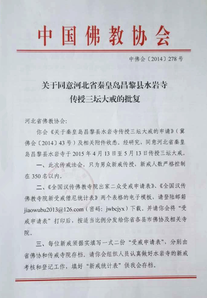 中国佛教新闻网河北讯:为绍隆佛种、续佛慧命、培育僧才、严净毗尼、住持佛法,经河北省佛教协会审核,河北省民族与宗教事务局和中国佛教协会批准,河北省秦皇岛市昌黎县水岩寺定于2015年4月13日至5月13日(农历二月二十五日至三月二十五日)举行“传授三坛大戒法会”(男众新戒)。现将有关事项通告如下: