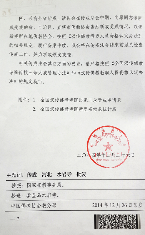 传戒时间:2015年4月13日至5月13日(农历二月二十五日至三月二十五日)