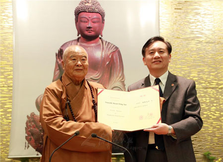 佛教在线台湾讯 百年名校上海交通大学敦聘佛光山开山星云大师为名誉教授,2015年1月16日在佛光山传灯楼集会堂举行颁发证书典礼,上海交通大学书记姜斯宪在众人见证下,正式聘任星云大师为上海交大名誉教授。
