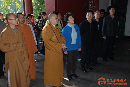 传正法师陪同王志珍副主席一行参观并介绍了南华禅寺的主要建筑和近几年的发展情况。王副主席参观了大雄宝殿、藏经阁、灵照塔,并在祖殿瞻仰了六祖真身和憨山大师真身及丹田大师真身。