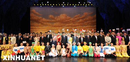 演出结束后,胡锦涛和克雷文等走上舞台,同演职人员合影,祝贺演出成功。