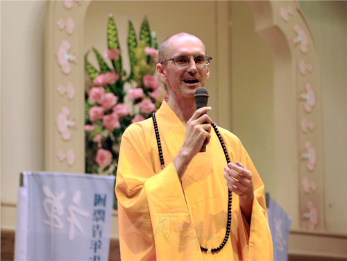 时逢2014年国际青年生命禅学营活动,全球五大洲逾40个国家地区、400所大学共1500名青年齐聚佛光山,吹起一股全球青年修行风。族群不同、文化背景各异的外籍青年,17日中午鱼贯进入云居楼过堂时,看到西方面孔的慧峰法师身披红祖衣,端身正坐在斋堂,个个惊讶不已,不少青年窃窃私语:“佛光山的大和尚是外国人耶!”