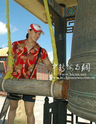接着,奥运冠军们一起来到南海观音广场,瞻仰一百零八米高的南海观音圣像,并撞响吉祥钟祈福。奥运冠军们十分虔诚地双手合十面向南海观音圣像,口中念念有词。“我祈福我和家人平安幸福,祈愿在二0一二年伦敦奥运会再夺金牌。”北京奥运会男子举重六十九公斤级冠军廖辉笑呵呵地说。