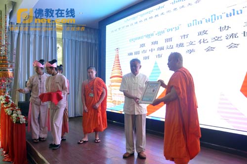 云南省佛教协会会长刀述仁为瑞丽市佛教协会会长诏等傣颁发证书