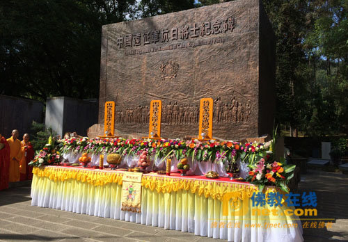 佛教在线云南讯 2014年6月12日上午,中国远征军抗日阵亡将士公祭活动在云南腾冲举办。当天,云南腾冲国殇墓园前,各界群众肃立路边,气氛庄重、肃穆,健在的六位远征军老兵们,见证了24位战友的遗骸与骨灰从千里之外归葬于中国远征军抗日阵亡将士墓中。到场嘉宾为归葬于墓中的忠魂默哀致敬,鞠躬行礼,现场恭读了祭文。云南省委统战部部长黄毅主持了仪式,云南省佛教协会副会长、圆通寺方丈淳法法师带领僧众拈香诵经,超度英灵。