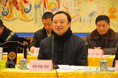 杨伯明副局长在讲话中说,听了佛协的工作总结,觉得是听到过的最满意的工作总结之一,很实在,很具体,不空不悬,佛协在一年时间,完成了这么大的工作量,取得了这么丰硕的成果,付出了大量的精力和劳动,令人赞叹。对于新一年的工作,他说,2014年的工作安排,展现出名山应有的精神,相信全体僧众、员工在佛协的领导下,一定能完成目标,为当地经济、社会、文化发展,作出新的贡献。对新一年的工作,他提出了三点希望:一是峨眉山佛教的硬件建设,峨眉山佛协在硬件上投入了大量的人力和财力,有特殊功能,佛教的建筑体系,存在的功能首先是宗教功能,承载的理念、用途离不开佛教,但与峨眉山旅游、景区的关系也密不可分,也承载了旅游功能,这些理念与立意展现出了峨眉山僧众的境界与胸怀,峨眉山佛教硬件建设主题思想明确,有清醒的认识、准确的定位,承载了宗教、旅游功能,既守住了根本,又与现代社会融合,这是需要很高的智慧的。二是要坚持不懈抓好人才建设,包括“3.5个”队伍建设,即僧尼队伍、员工队伍、义工队伍、外围人才。峨眉山僧尼队伍在全国来看,相对稳定,峨眉山能严把僧人进出口关,但人数少,还需补充;员工,非宗教职能的事务,由员工做,员工非单一打工人员,也有爱护建设峨眉山的任务;义工队伍可借鉴友教的经验,在信众群体中发掘,有条件在寺院从事义务工作,无偿培福,有不可替代的作用,信众在弘法上起主体的作用,法师们则是起到主导的作用;外围人员,只能算半个队伍,他们有心于佛教,但知识不系统,也能对佛教作贡献,通过各种方便,慢慢把他们发展为义工,成为佛教的基本队伍。三是文化建设,要发展佛教事业,就要抓住硬件、人才,二者的联结体是文化,峨眉山佛教文化要有自己的特色,这就是普贤文化,文化产品提供给消费者,要细化,养生、茶艺、书画这些文化活动才有活力。他最后希望峨眉山佛教有新的探索,新的收获,新的发展,为经济建设服务,在马年充满新的活力。