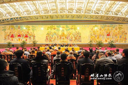 永寿法师致开幕词。他说,过去一年,佛协在党和政府的领导与主管部门的关心支持下,与全山僧众、员工一道,稳步推进各项工作,自养事业和宗教性收入基本稳定,寺院场所清净庄严,和谐安全,取得了良好的成绩。关于佛协去年所取得的主要成绩,他说,佛协根据峨眉山市和峨眉山风景区“同城一体、景城联动”发展方向和总体规划布局,顺势加快了推进金顶二期工程和千佛顶寺院恢复重建的规划建设;调整了大佛禅院的总体规划布局,征地125亩,规划建设峨眉山佛文化中心(金色华藏)项目,发展养生养老的慈善事业,提升佛文化功能;完善大佛禅院西大门,实现峨眉山风景区与大佛禅院佛教文化旅游区的无缝、安全对接,为创建5A级景区奠定基础,为峨眉山佛教的持续发展拓展空间,增强了自养事业的内生动力。关于峨眉山佛教的发展,他说,峨眉山佛教要发展,必须顺应时代发展要求,依托自身优势,创新开拓弘法途径和模式,特别要利用我们的优势,发展养生文化,建设一站式养生度假休闲目的地。最后,他满怀信心期待理事们,“用党的十八大和三中全会的精神武装头脑,指导工作、推动实践。坚定在新的历史起点上推进改革创新的信心和勇气。牢固树立进取意识、机遇意识、责任意识和发展意识,充分认识佛协今后几年所面临的困难,坚持‘勤于学、敏于思’,集贤聚智,不断进取,努力做好新一年的本职本岗位的工作,为峨眉山佛教的每一步发展打好基础。”