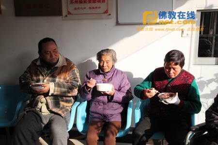 老人们品尝弘化社义工精心熬制的腊八粥