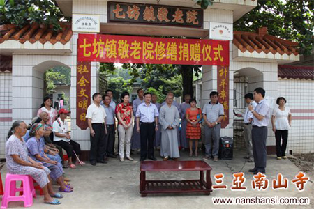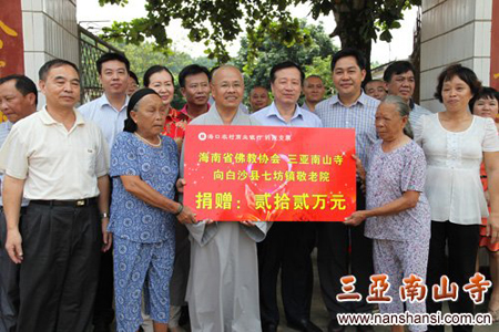 智法法师代表省佛教协会会长印顺法师和三亚南山寺向七坊镇敬老院捐款22万元用于修缮房屋。智法法师在代表印顺法师作发言时说,中央六部门联合下发的《关于鼓励和规范宗教界从事公益慈善活动的意见》,充分体现了党和政府对宗教界从事公益慈善活动的肯定、支持和重视,充分反映了宗教界的心声,有利于宗教界增强责任感,提高社会服务意识,发挥积极作用,更好地走与社会主义相适应的道路。省佛教协会要努力弘扬慈悲济世,扶危济困的宗旨,引导四众弟子关注社会发展的需求,关注弱势群体和困难群众,积极从事社会公益慈善事业。根据国宗局关于继续开展“宗教慈善周”活动的通知精神,海南省佛教协会制定了实施计划,捐助白沙县七坊镇敬老院修缮危房就是实施计划之一。